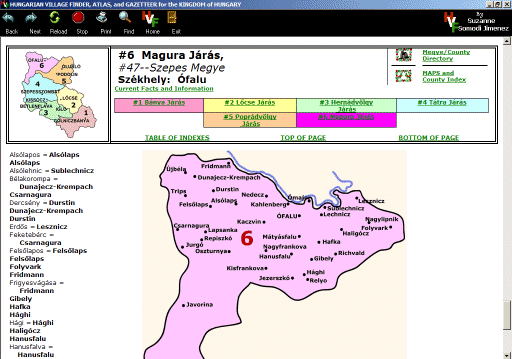 for the Kingdom of Hungary (website) and Hungarian Village Finder, Atlas, and Gazetteer for the Kingdom of Hungary (software) Copyright 2001-2005 All rights reserved. |