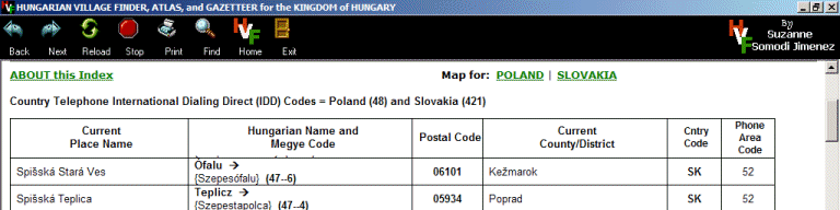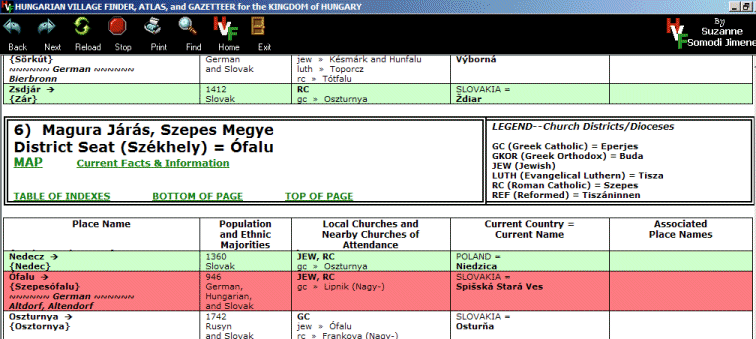 Using the provided links to the online LDS Family History Library Catalog, an Internet connection is made from the HVF program directly to the old megye (county) of Szepes. Following the prompts, the researcher learns that not only are the Ófalu Roman Catholic Church (1762-1927) and Jewish (1850-1942) records available for ordering, but the 1869 census can be ordered, as well! A final check shows that the Greek Catholic Church (1787-1895) records for Nagylipnik are also available. As an added plus, with the HVF map for Szepes Megye broken down into járás (districts), and each járás shown with a list of every village located within its borders during a specific time period, and with Internet links to old maps of Szepes in the Kingdom of Hungary or Austria-Hungary Empire, the researcher is easily able to see where Ófalu was located.![]() Finally, a quick search for "Spišská Stará Ves" in the HVF's Current Facts and Information for Szepes Megye gives the following information: ![]() Once you know the correct place name, where it was located and where it is today, you should be well on your way to discovering your family's roots and building your own family tree. Just try entering "Spišská Stará Ves" into GOOGLE. The return results are 379,000 in .20 seconds! And don't forget to try online phone books for the current country to see if anyone with your surname still lives in the town or perhaps nearby. Then you can look for your place of interest on current map sites like Map Quest and Multimap.com (links included in the HVF), or an interactive map for the country you are searching. And just think, when your research leads you to a new place name, as undoubtedly it will, you'll already have the tool in hand to quickly locate the town and begin gathering information for further researching. It’s just that simple, and NOW, with the HUNGARIAN VILLAGE FINDER, ATLAS, and GAZETTEER for the KINGDOM of HUNGARY software program, YOU too, may be able to accomplish a search just as easily. Order your's today to begin tracing your family tree and impressing your relatives and friends with your success. HAPPY HUNTING!! A